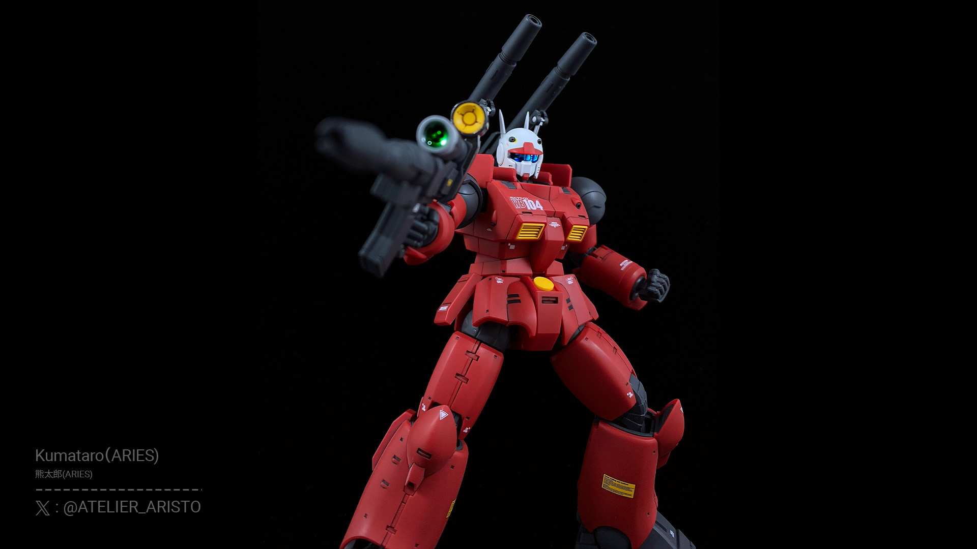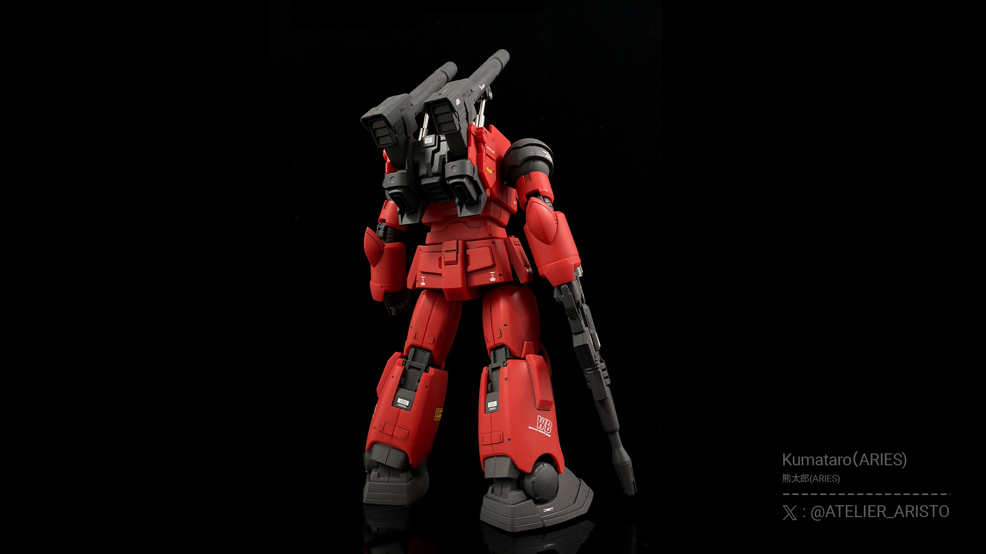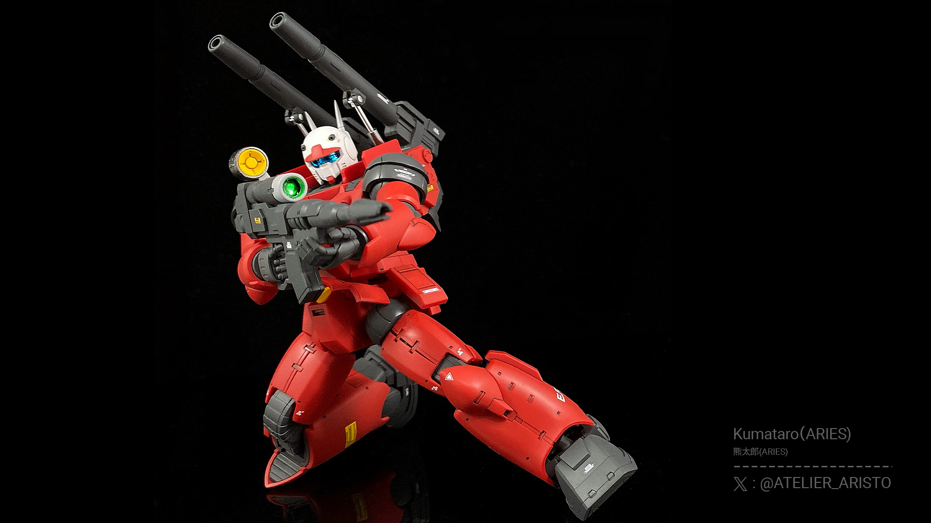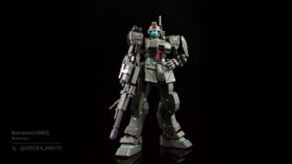 このキットでは使用パーツの選択により、カイ搭乗機とハヤト搭乗機が再現可能です。こちらの作品ではカイ搭乗機を選択しています。頭部のバランス調整、キャノン砲やセンサー部の加工などを行い、見た目の情報量を増やすことで、HGキットとは思えないほどのクオリティを誇る作品です。