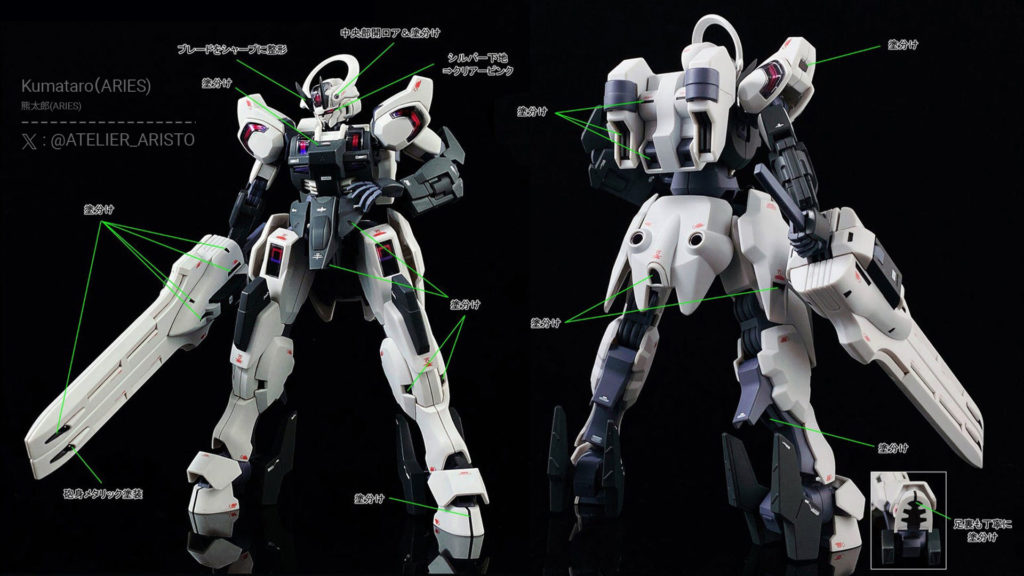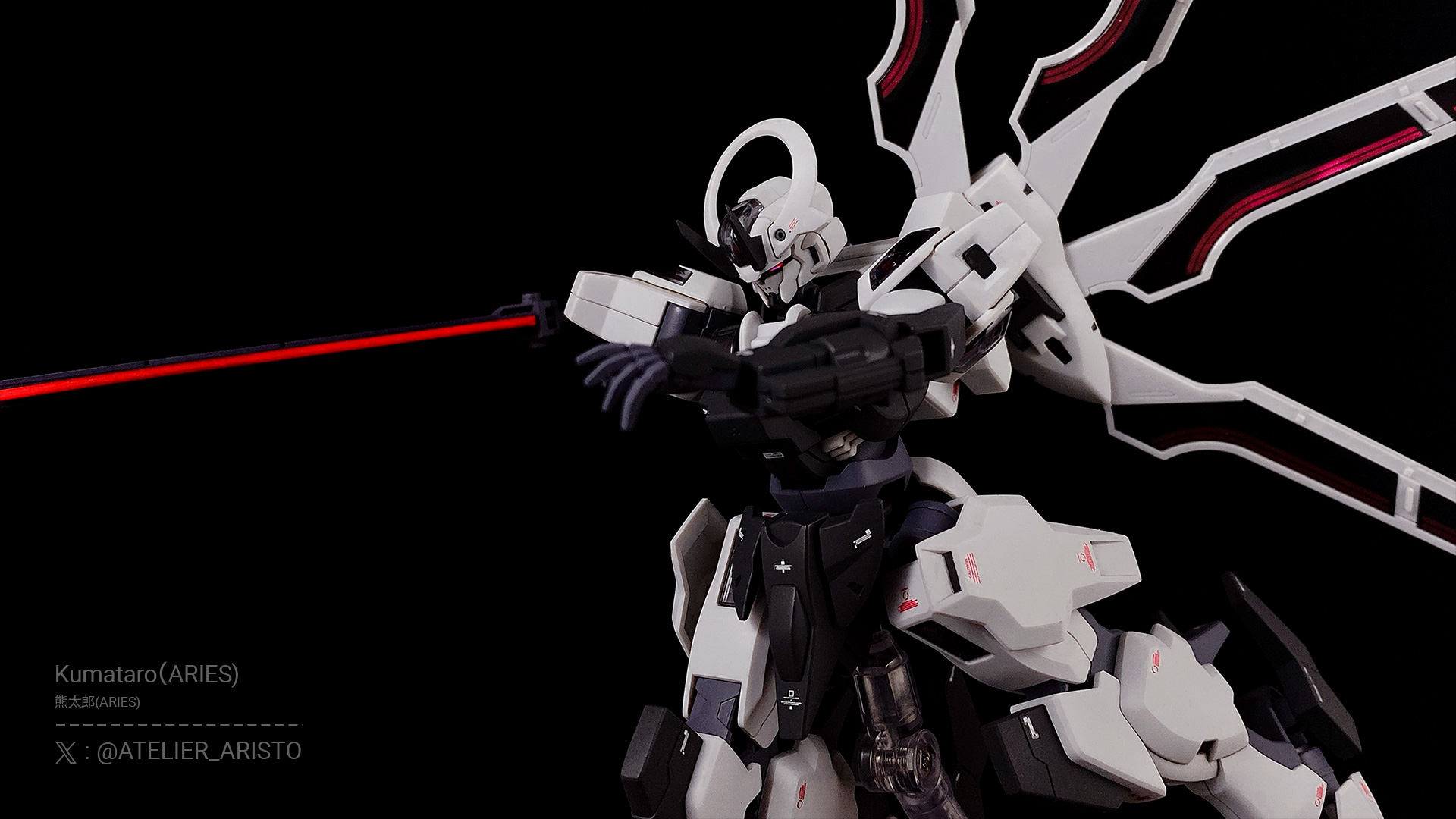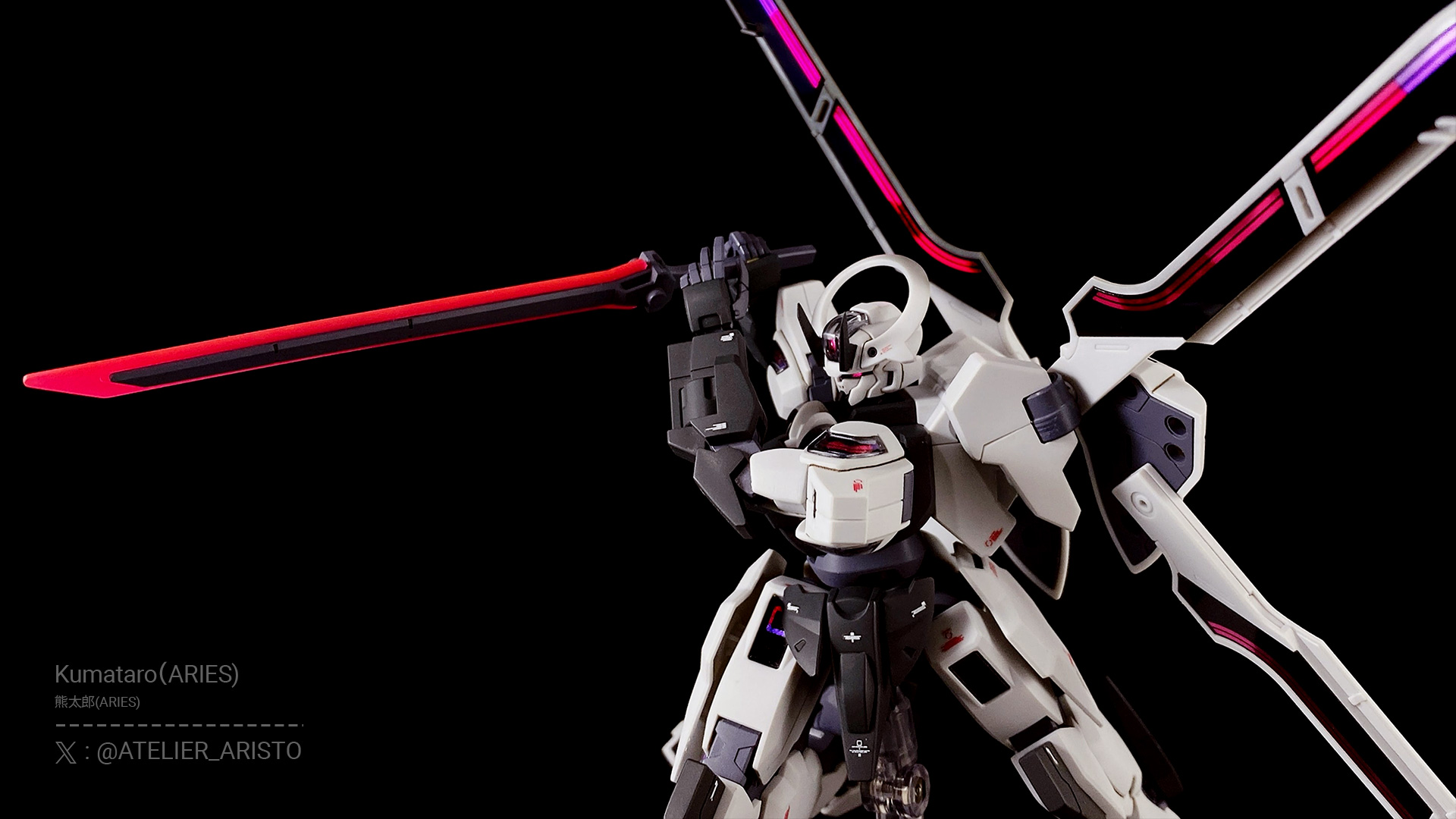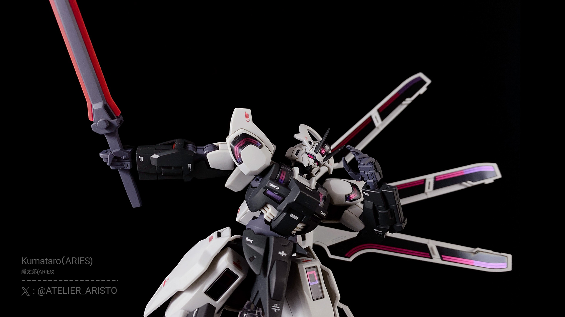 キットそのものを活かし、パーツの塗り分けなどのディテールアップを中心に仕上げられています。機体のカラーリングは基本的に設定準拠となっているものの、コントラストが強調されるような調色がなされています。また、関節の補強を行うことで安定したポージングを可能にしている点もポイントです。