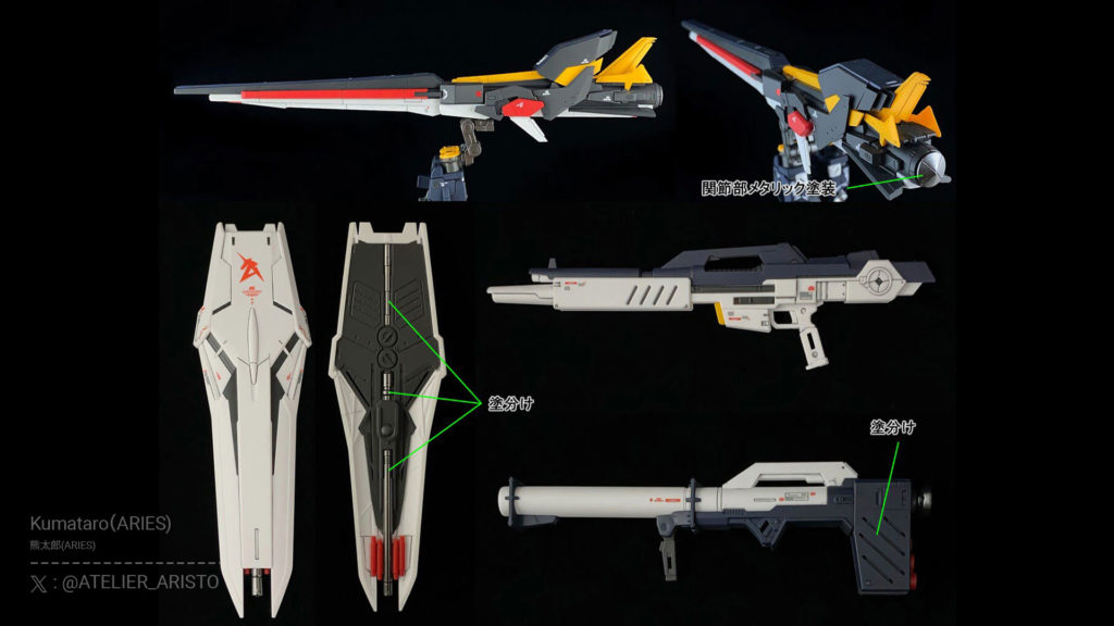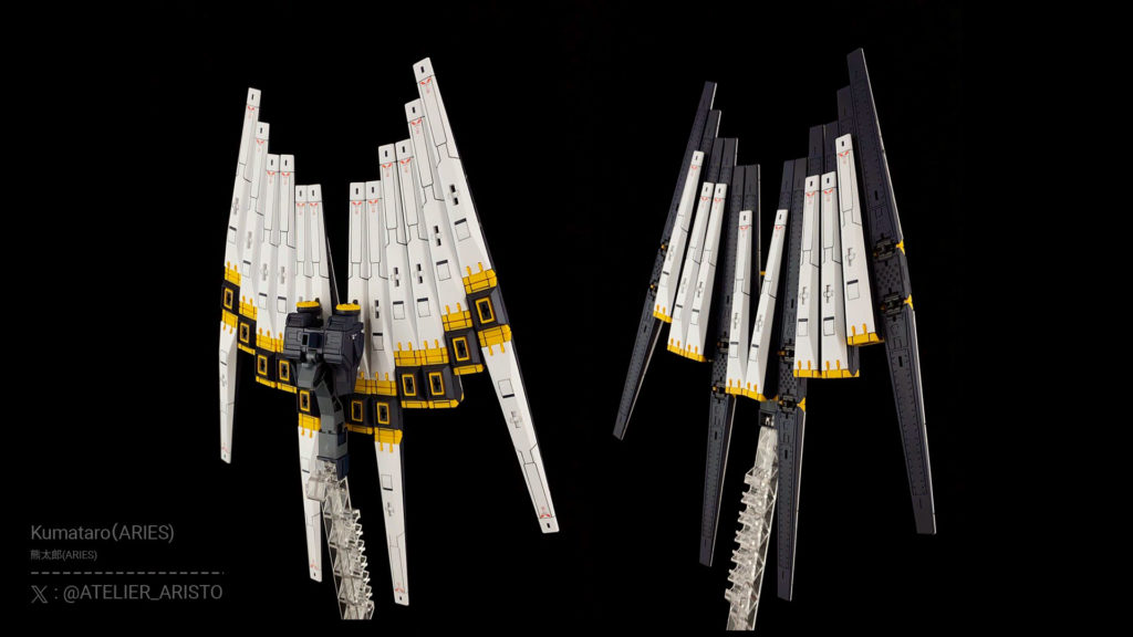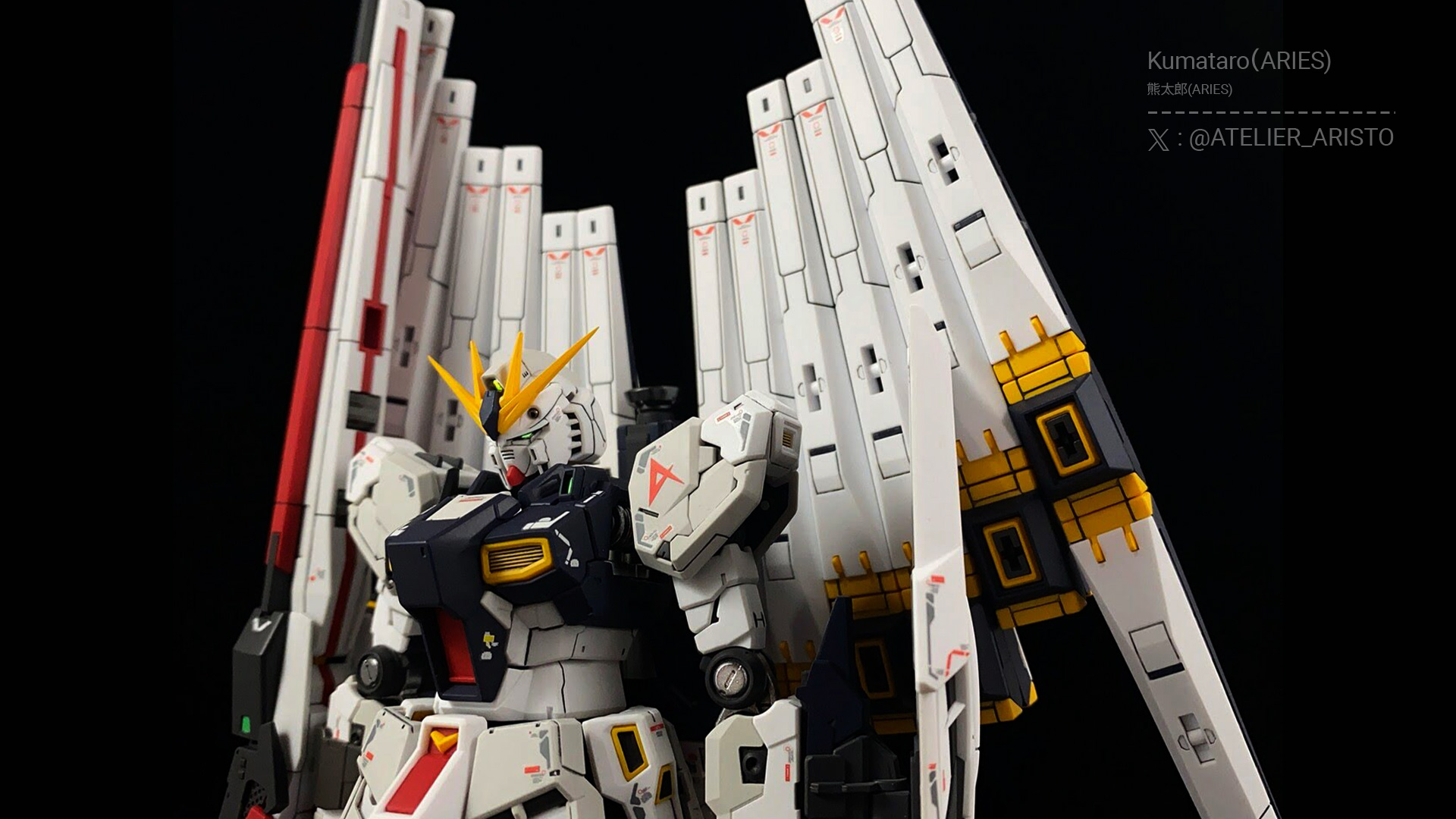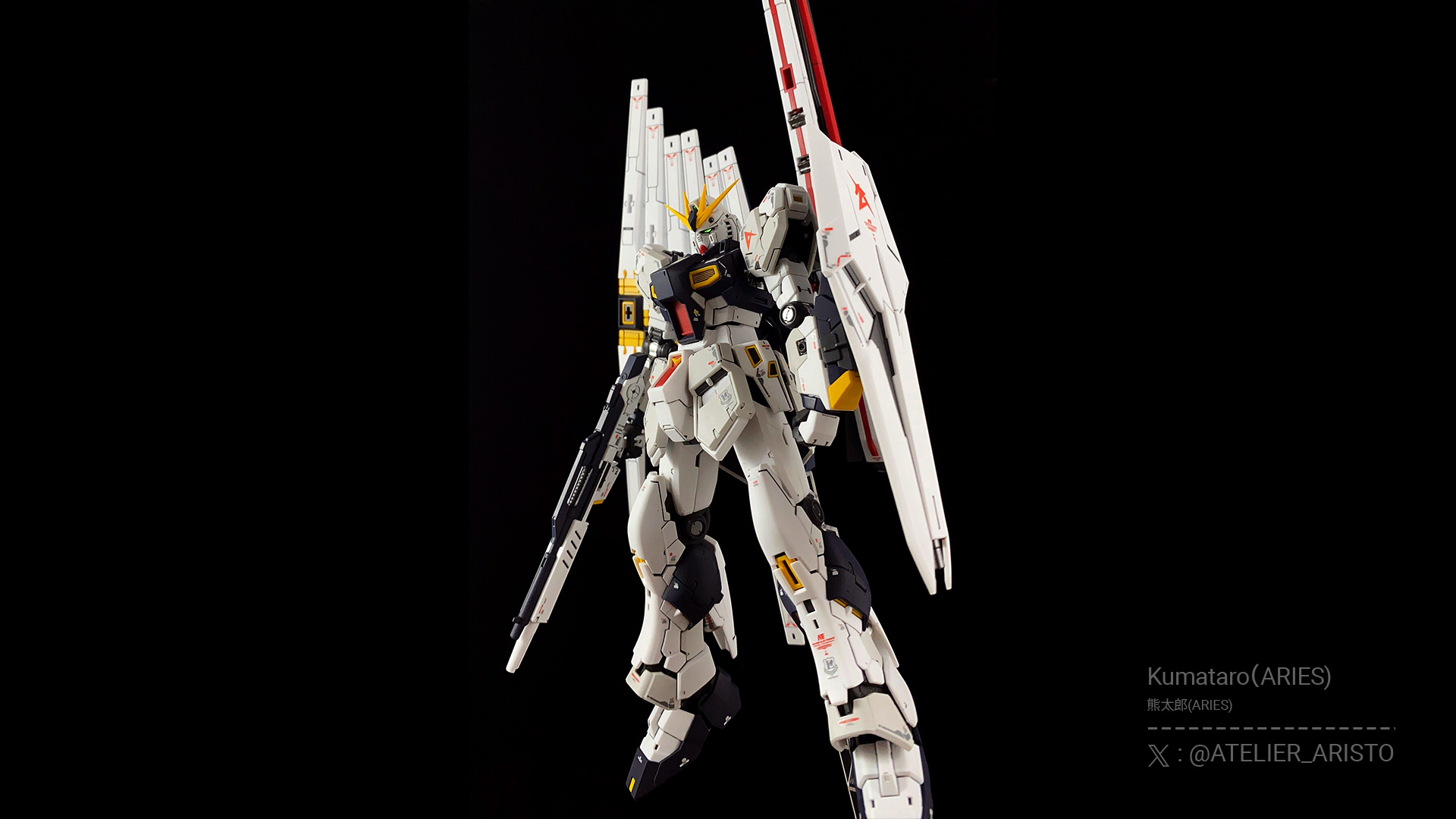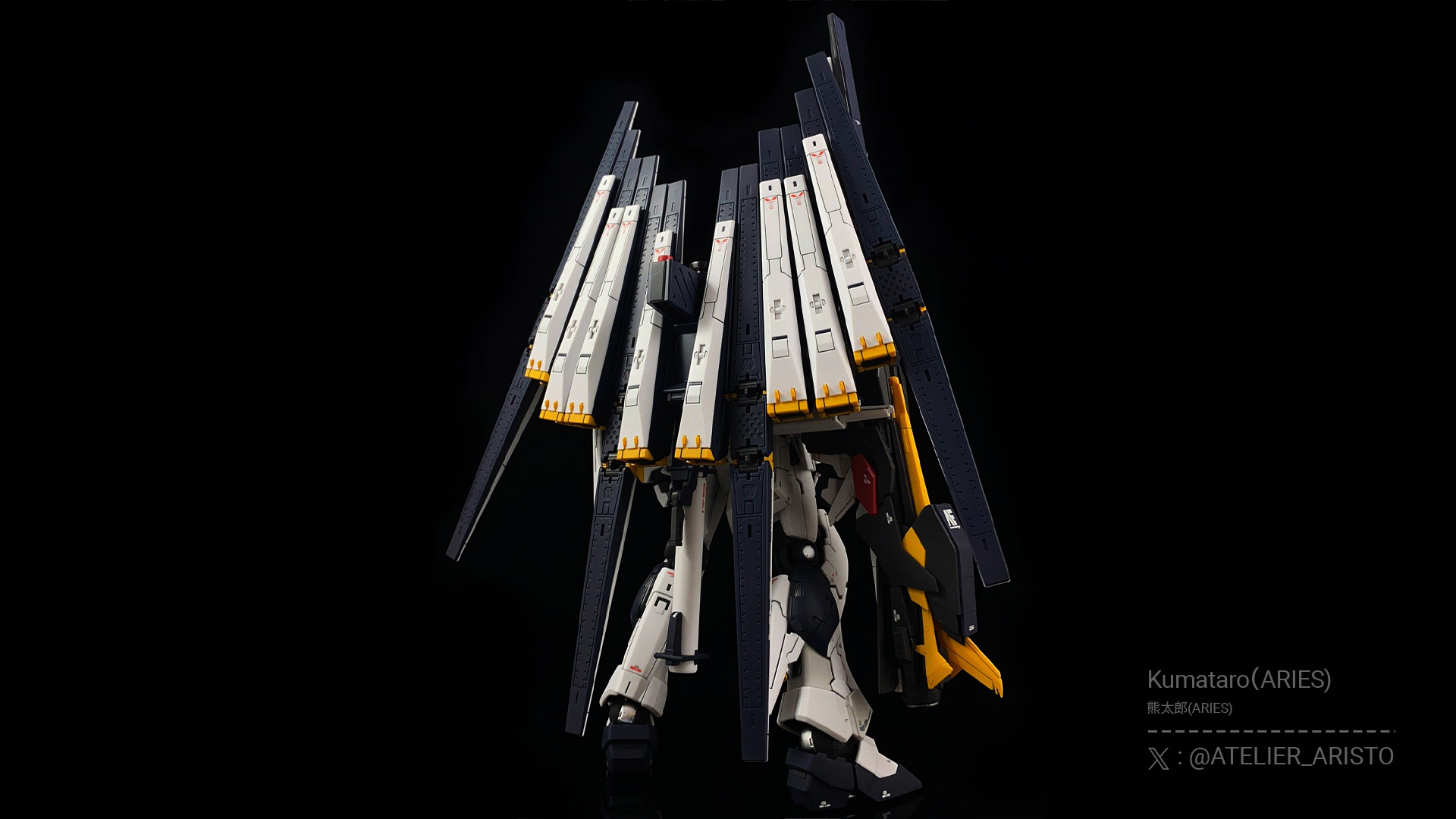 この作品は通常のRG νガンダムのキットを使用していますが、兵装をカスタムすることで『長距離支援仕様』という設定で制作されています。これらの兵装である”ダブルフィンファンネル”&”ロングレンジ・フィン・ファンネル”は、繊細なディテールアップが施されており、リアリティのある仕上がりとなっています。全体を通常キットのカラーリングに統一することで、クールな印象のある作品です。