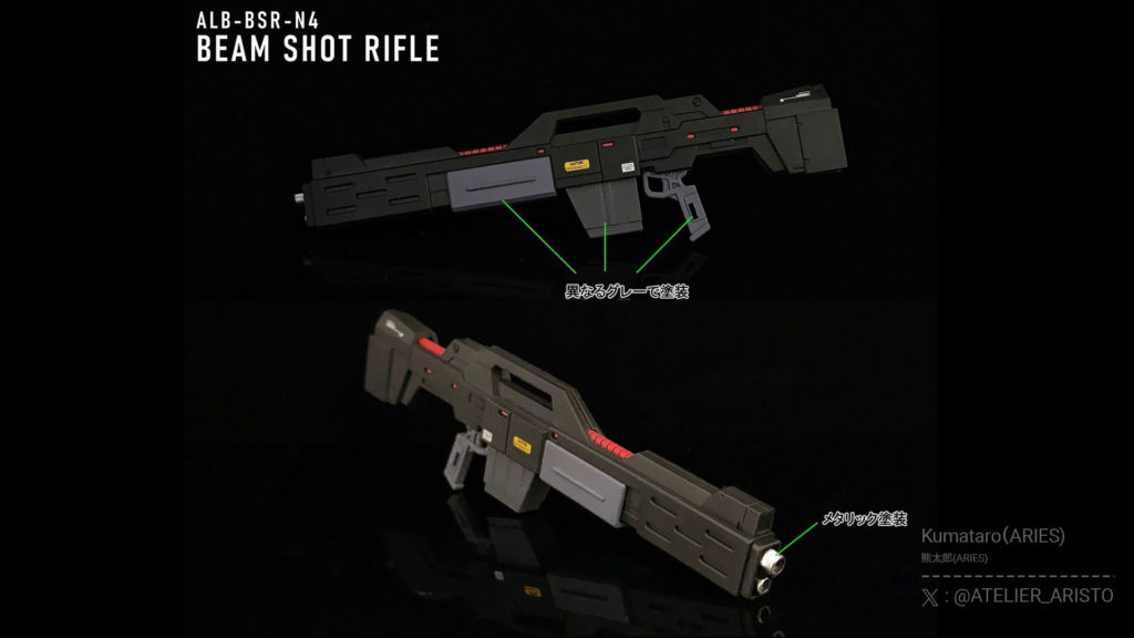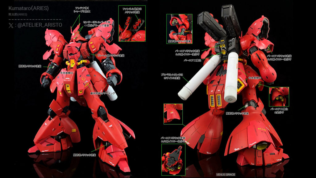 The RG Sazabi by Kumataro-san showcases a stunning red color. The outcome emits a captivating atmosphere by using a shade of red even deeper than the color guide in the kit and adding shading during the painting process. Metallic painting is applied to the joints, each part is painted individually, antennas and verniers are modified, and markings resembling those in the Universal Century Gundam series are included to elevate the level of intricacy. Consequently, the realism of the RG (Real Grade) kits is further intensified.